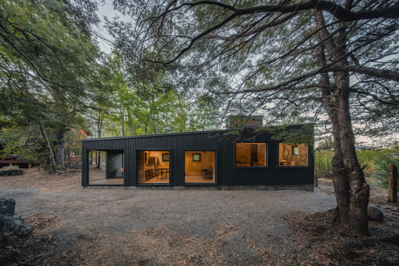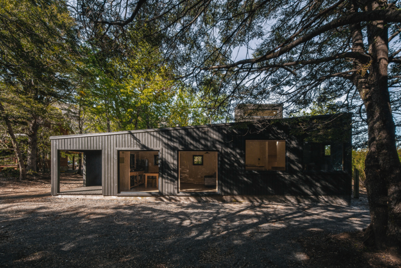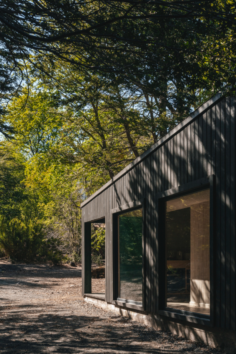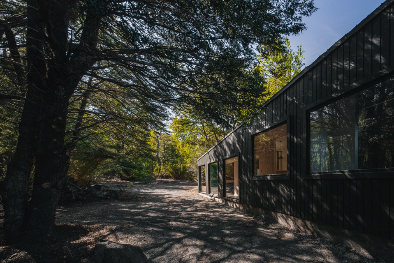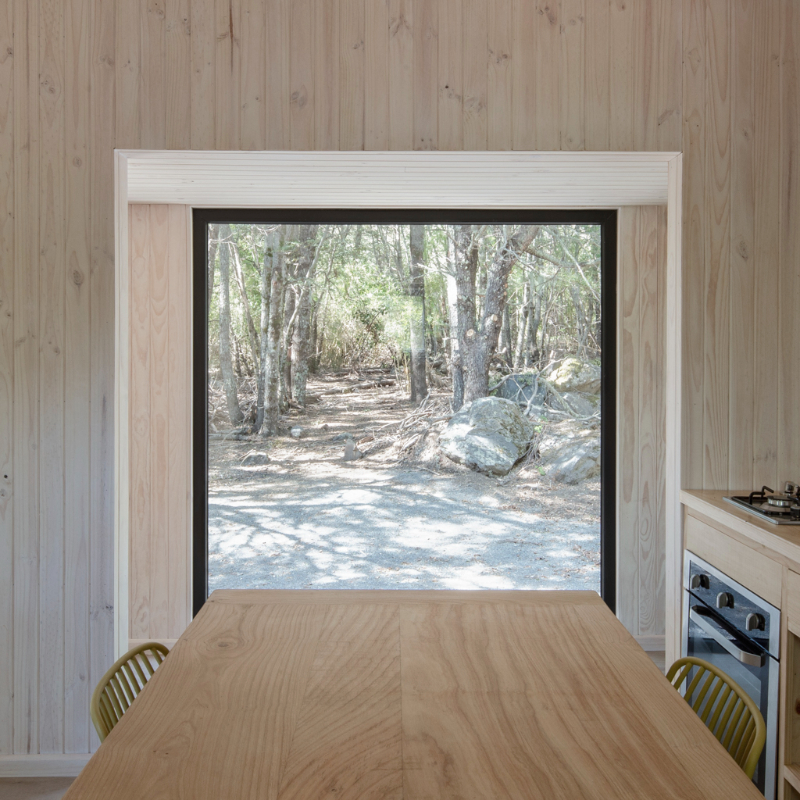 There are two predominant spatial conditions. The first is that each act within the shelter has a visual projection towards the landscape. The cooking and eating area, the living room, the sleeping area and the bathroom each have a two meters wide opening. The second, is that the circulation is a linear corridor, which provides a thickness that transforms the views into a spatial frame through which to look at the landscape.