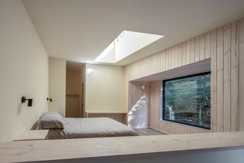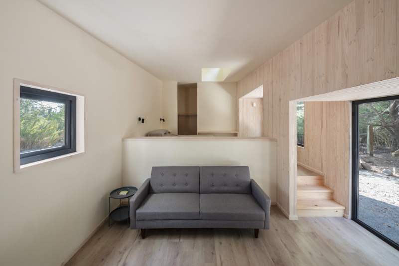 The height of the trees makes it difficult for light to enter through the large openings, which is why it was decided to open a skylight in the highest part. Despite being a mono-space, the floor generates an unevenness that raises the bedroom to give it greater separation.