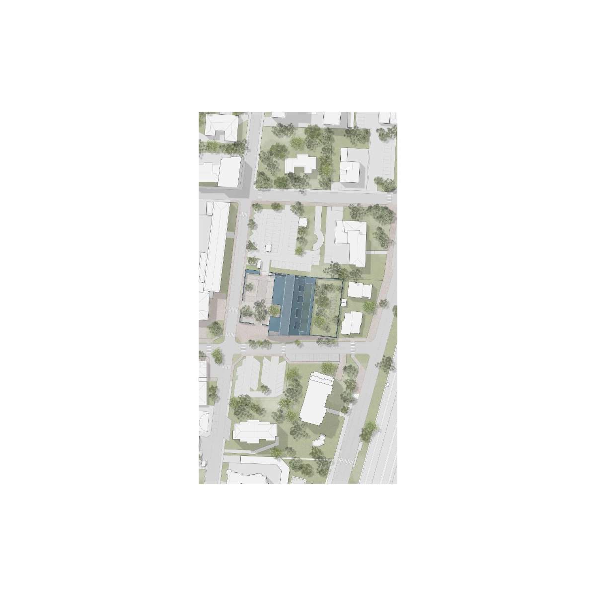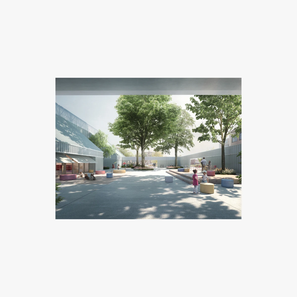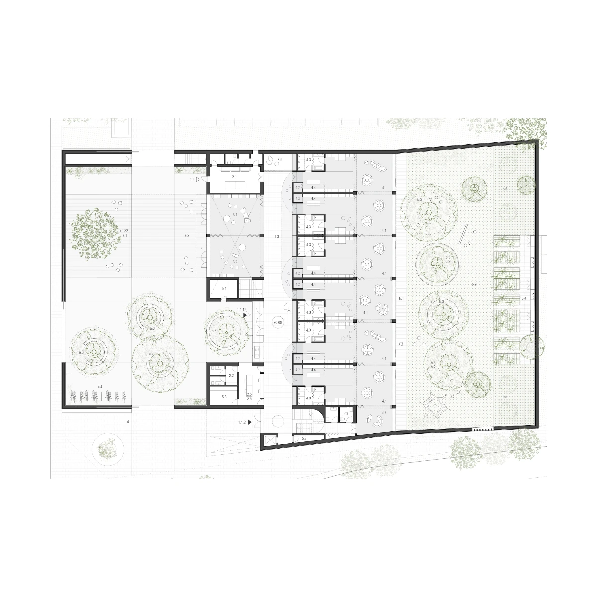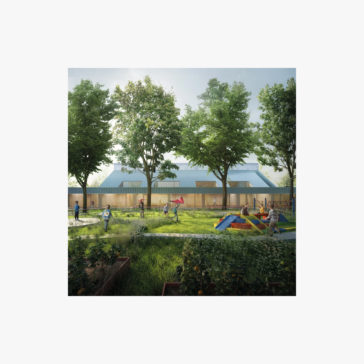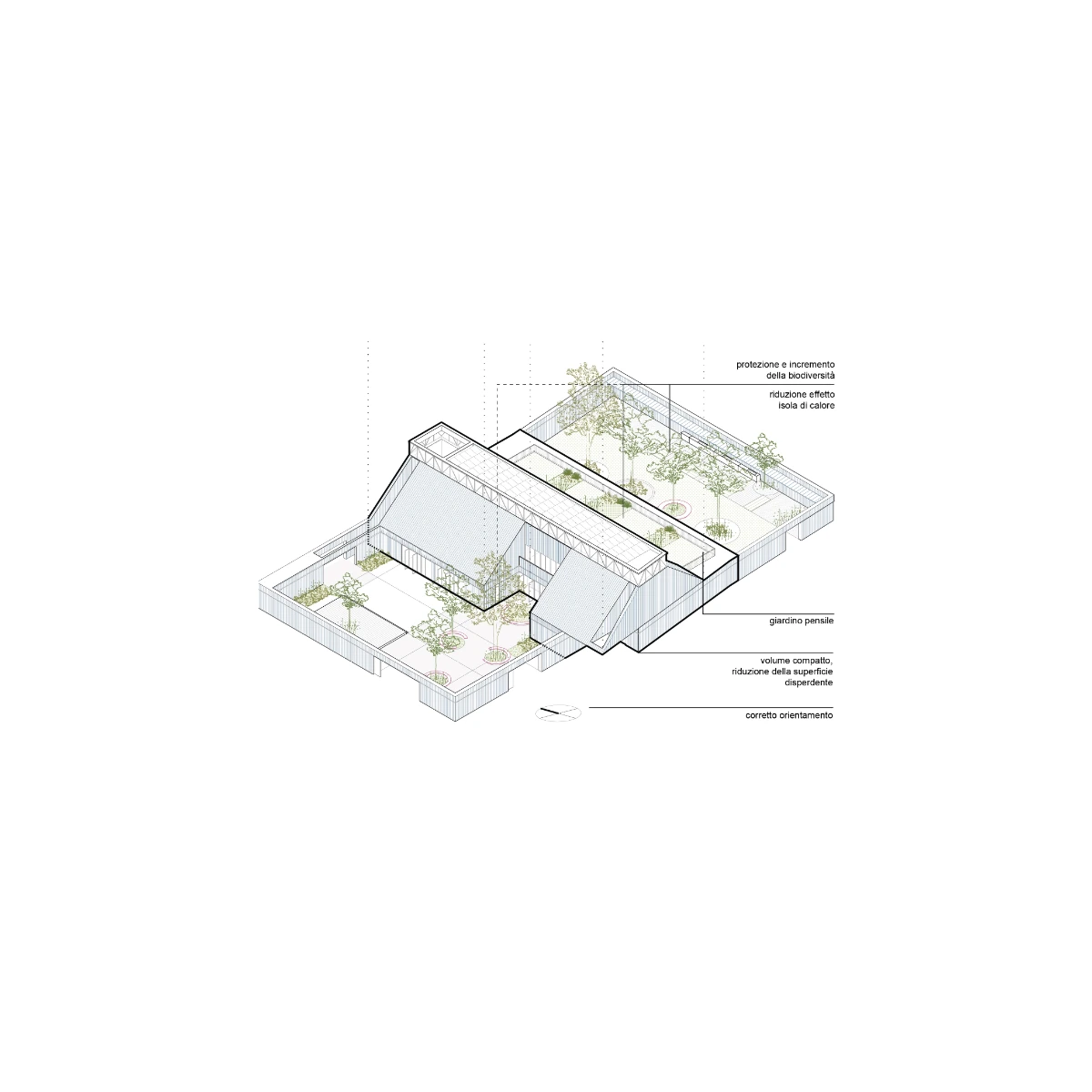 The building, oriented by interpreting the main directions of the context and respectful of the existing trees which are preserved in their entirety, is concentrated in a compact volume located in the middle of the area, reducing land consumption to a minimum to maximize and generate open spaces: to the west, a “square” conceived as a semi-public place and main interchange hub; to the east, a more private “garden” serving school activities.