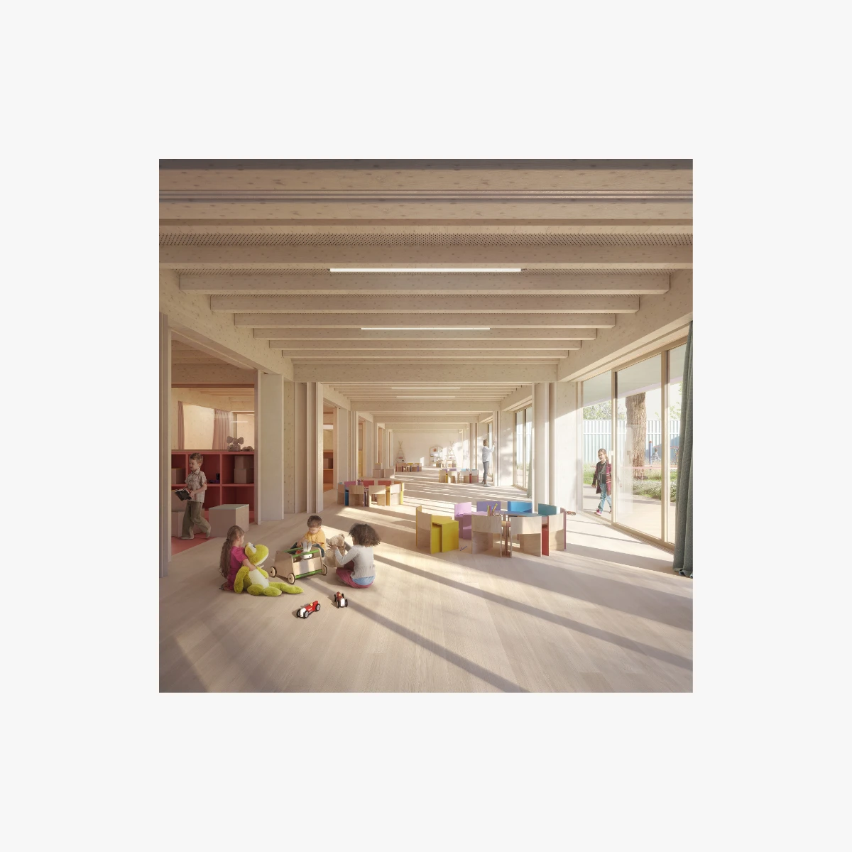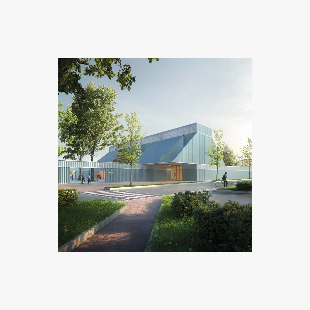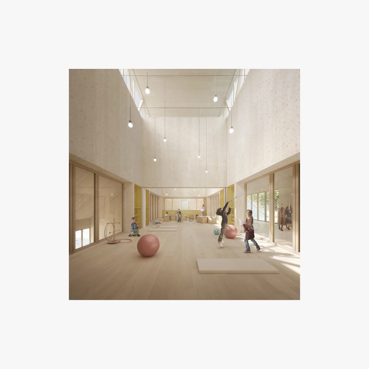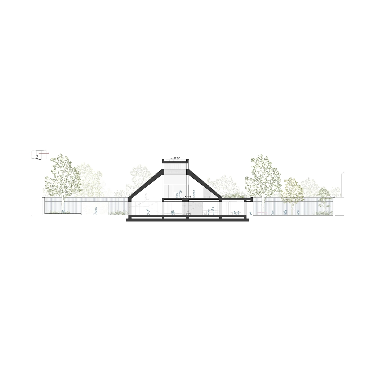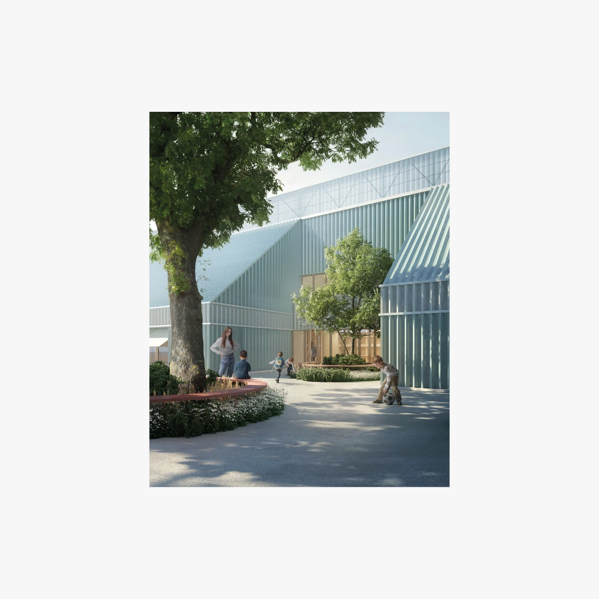 The building, oriented by interpreting the main directions of the context and respectful of the existing trees which are preserved in their entirety, is concentrated in a compact volume located in the middle of the area, reducing land consumption to a minimum to maximize and generate open spaces: to the west, a “square” conceived as a semi-public place and main interchange hub; to the east, a more private “garden” serving school activities.
