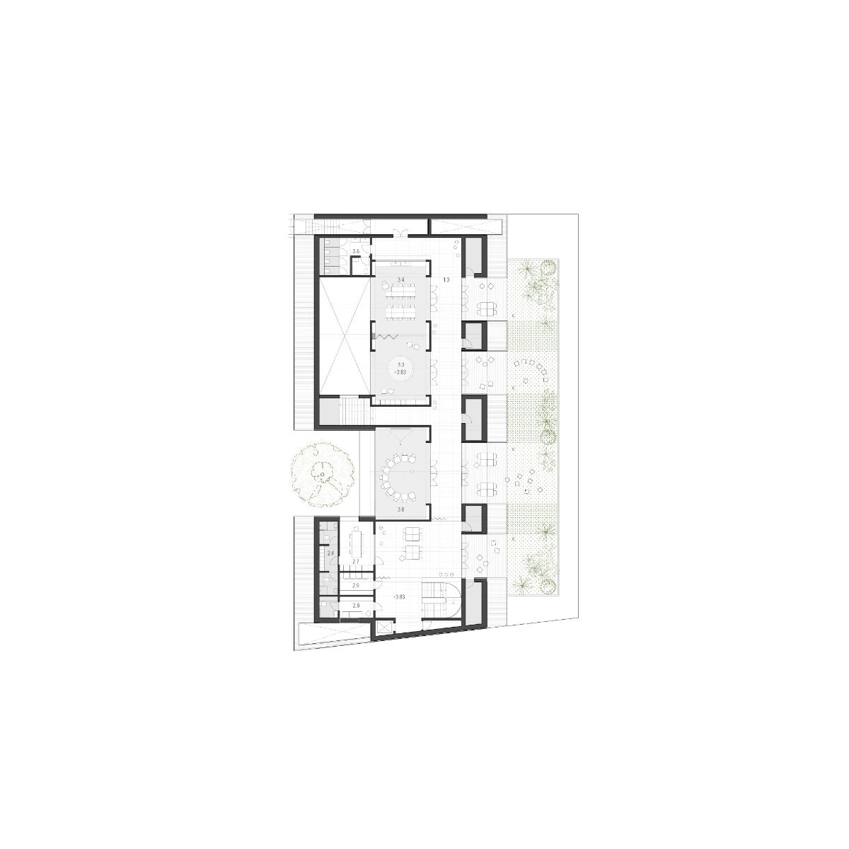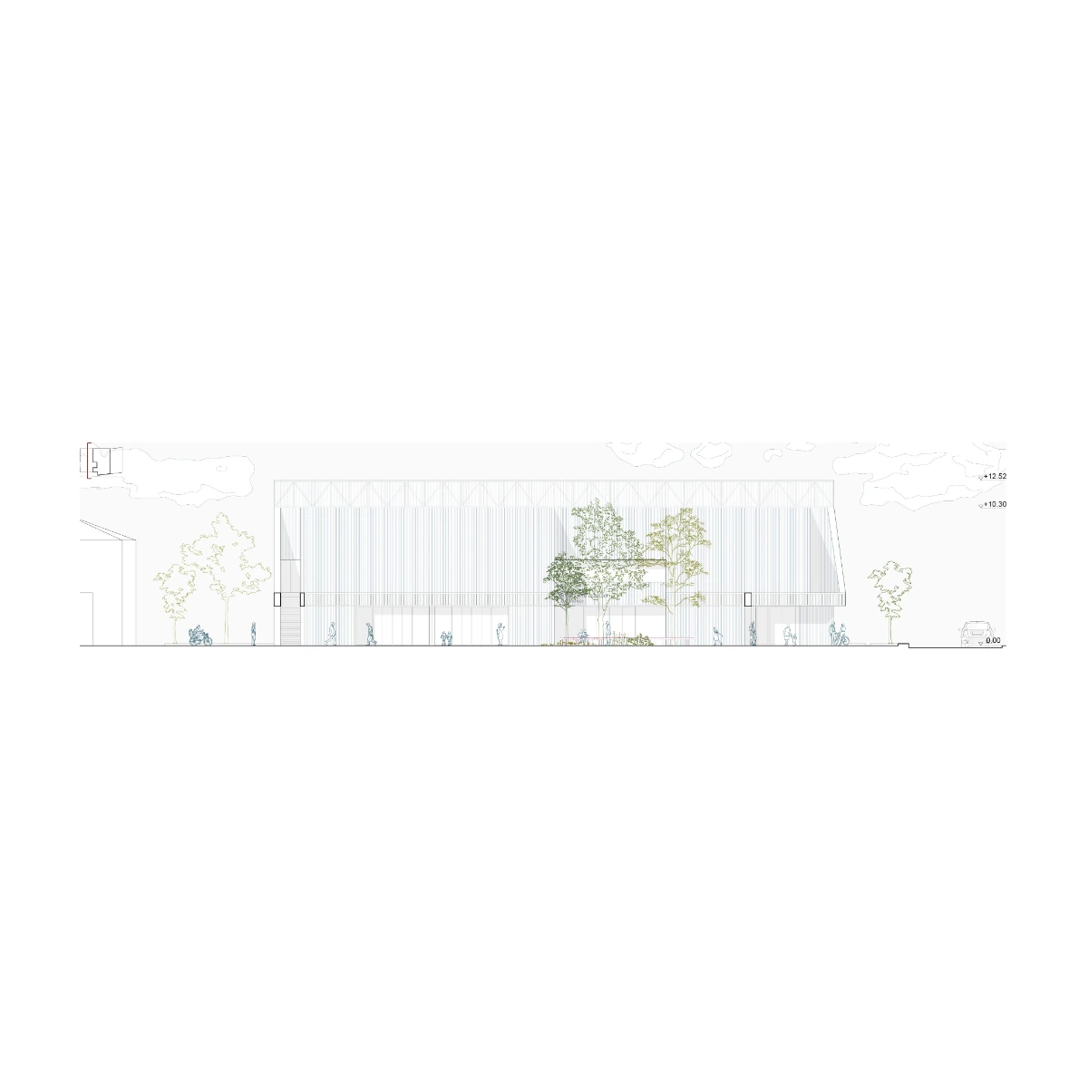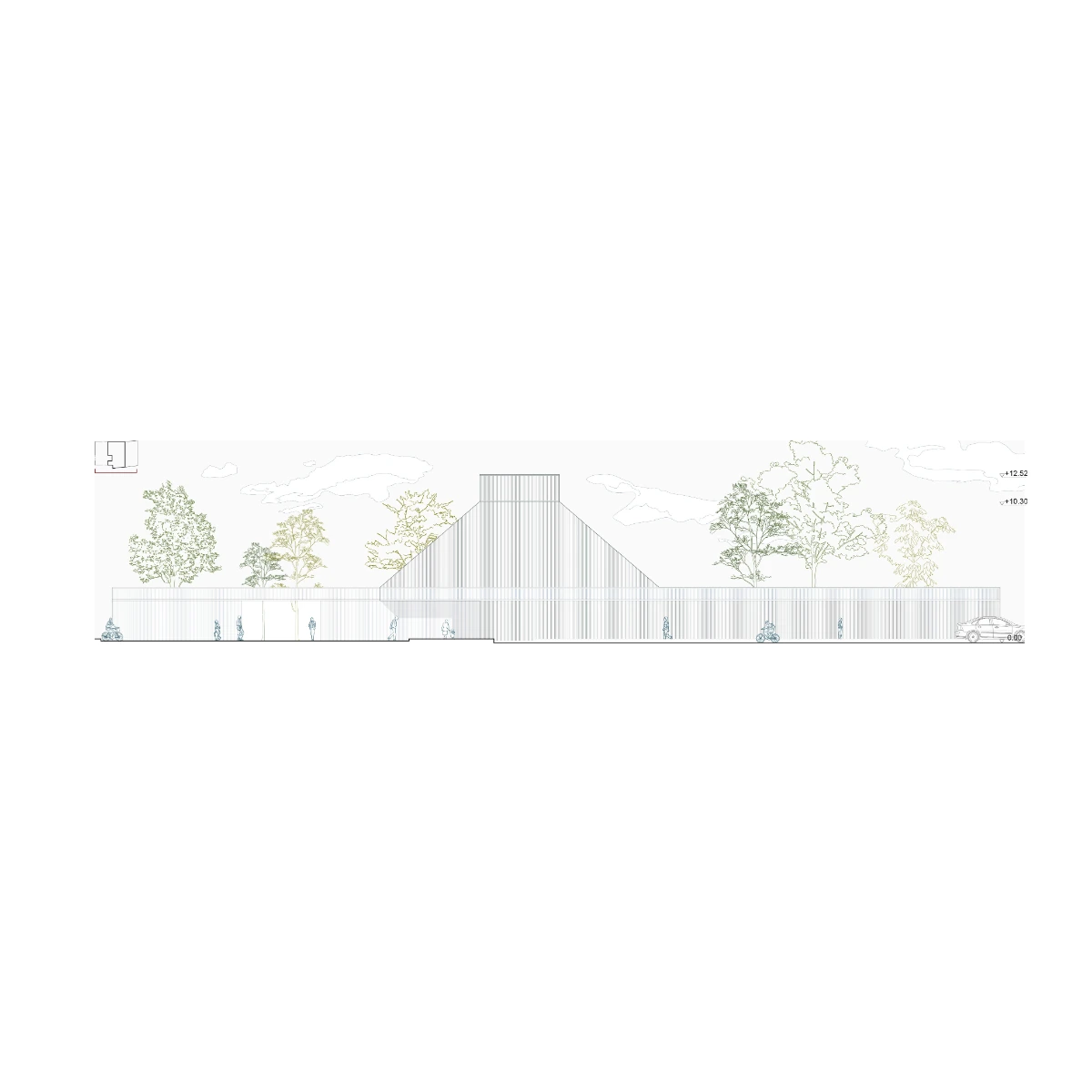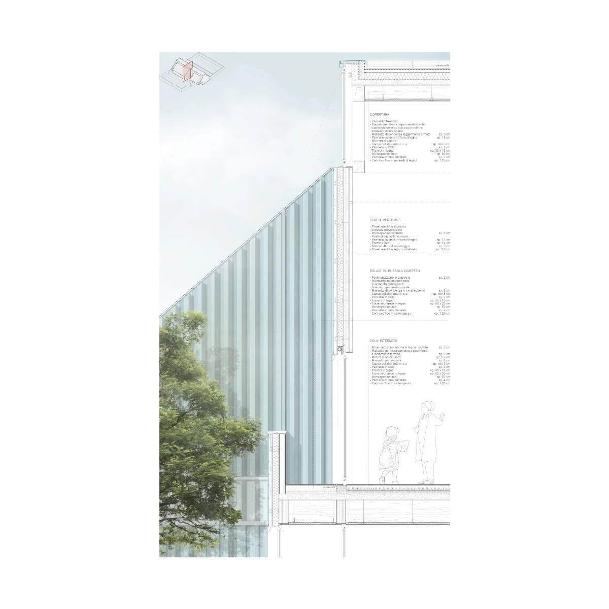To the south, the building interacts with the fence which, stepping back, generates a further open space, underlining the main public front of the building.