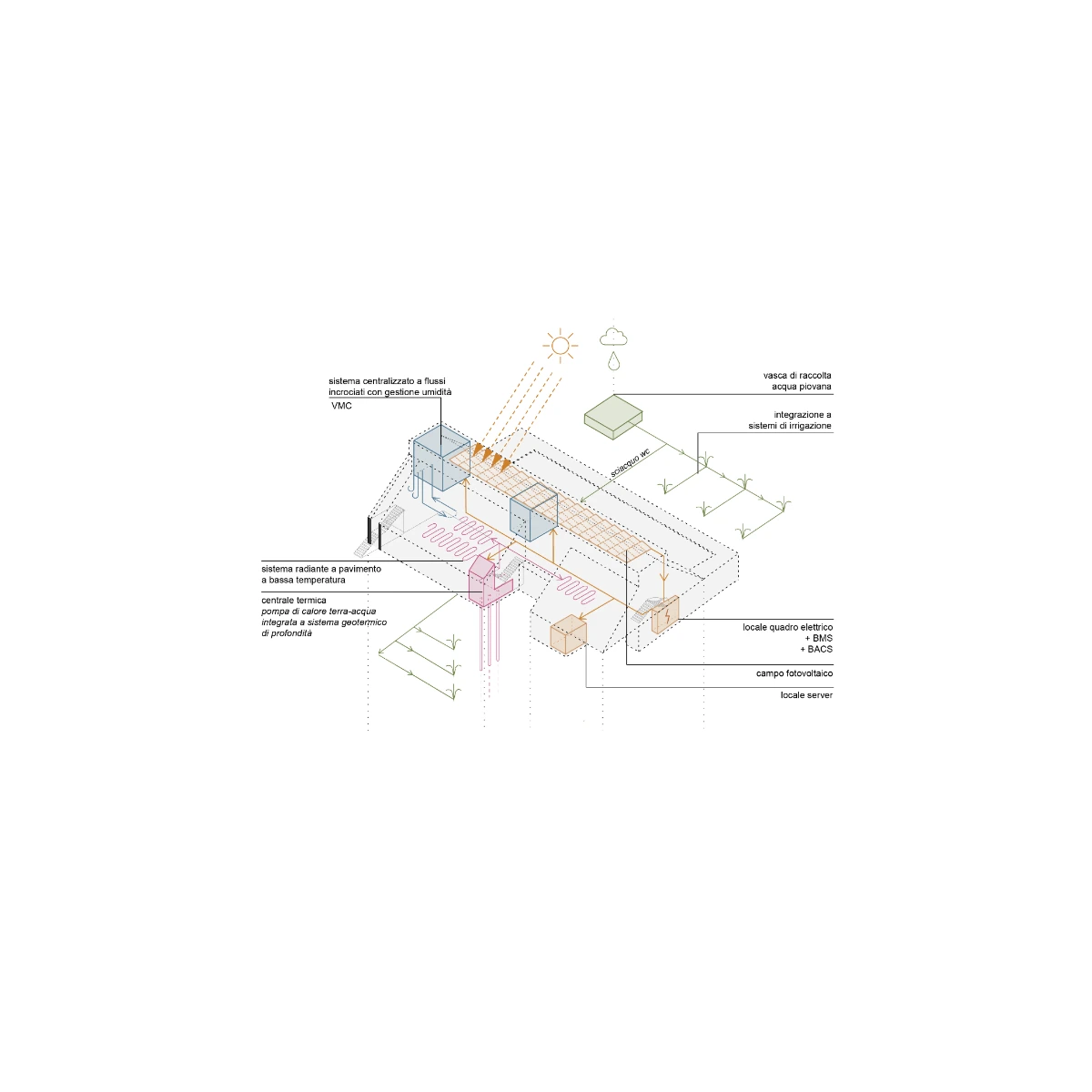 The project generates from an integrated approach between architecture, structure and systems and is aimed at giving a unified response to the theme of environmental sustainability,