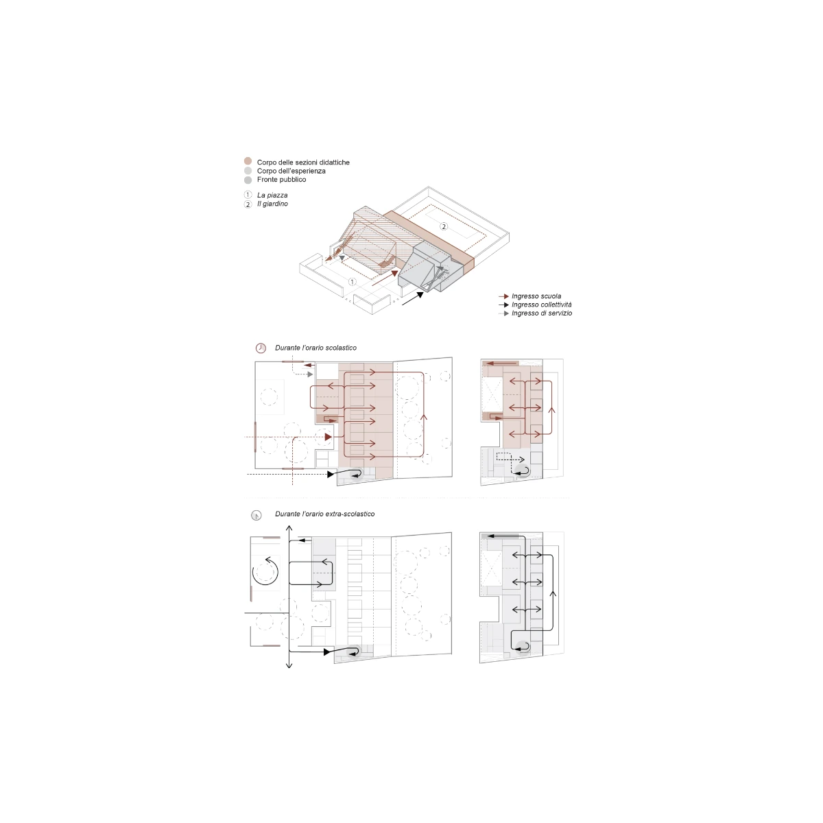 The enclosure, thanks to the openings placed in strategic points, regulates and directs flows (scholastic, extra-scholastic and civic in general), modulating the different degrees of intimacy with the city and amplifying the connective role of the lot with the surrounding system of public spaces.