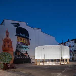 The design is simple and elegant – three racks, three rings, the upper of which is mounted on racks, the other two are suspended on it and stretched by ropes to the ground. The screen is a canopy of translucent fabric thrown over the rings with the motifs of traditional Cypriot lace reinterpreted in the pattern.