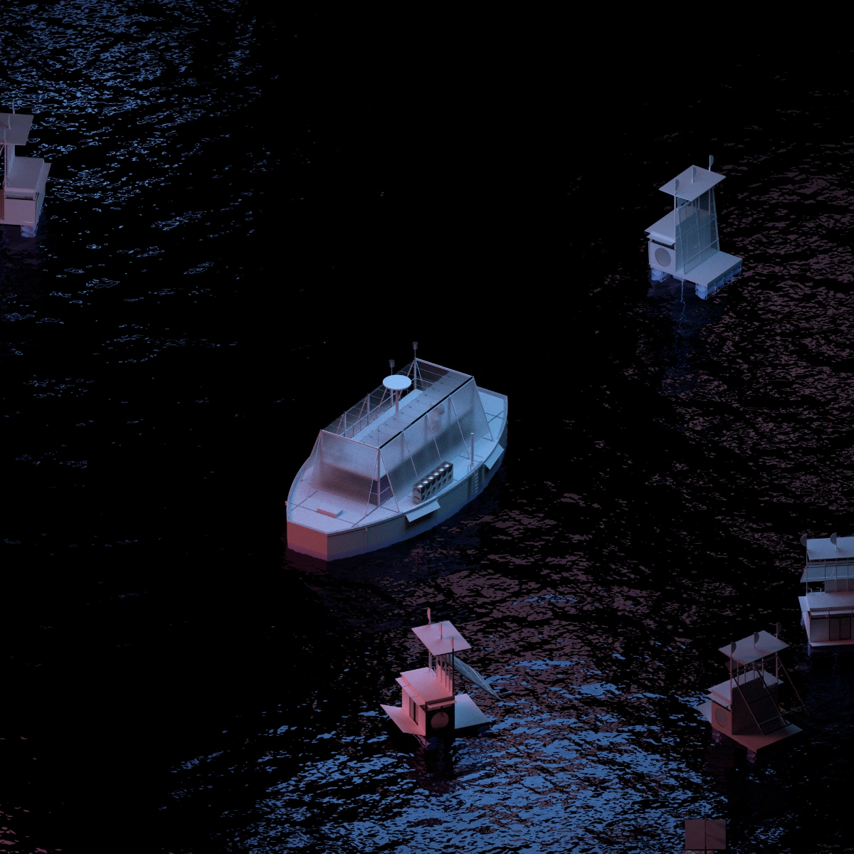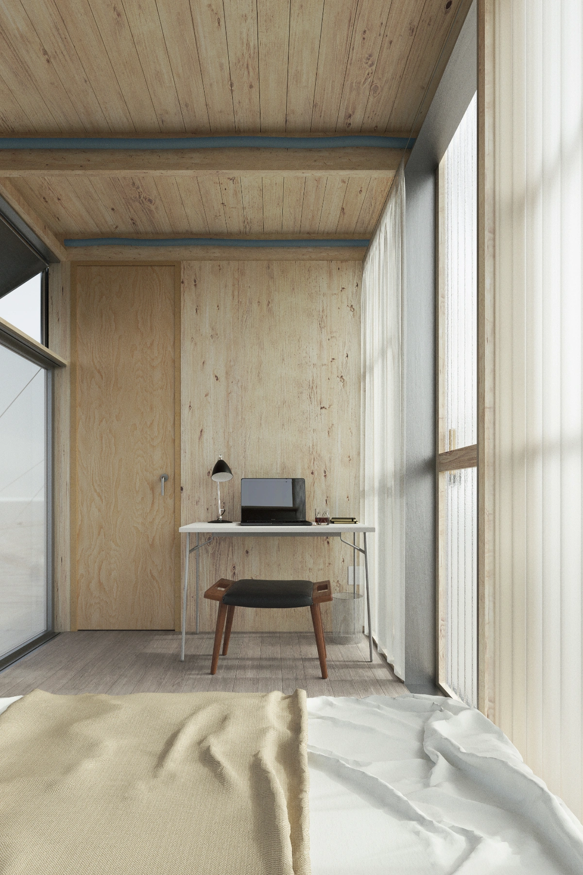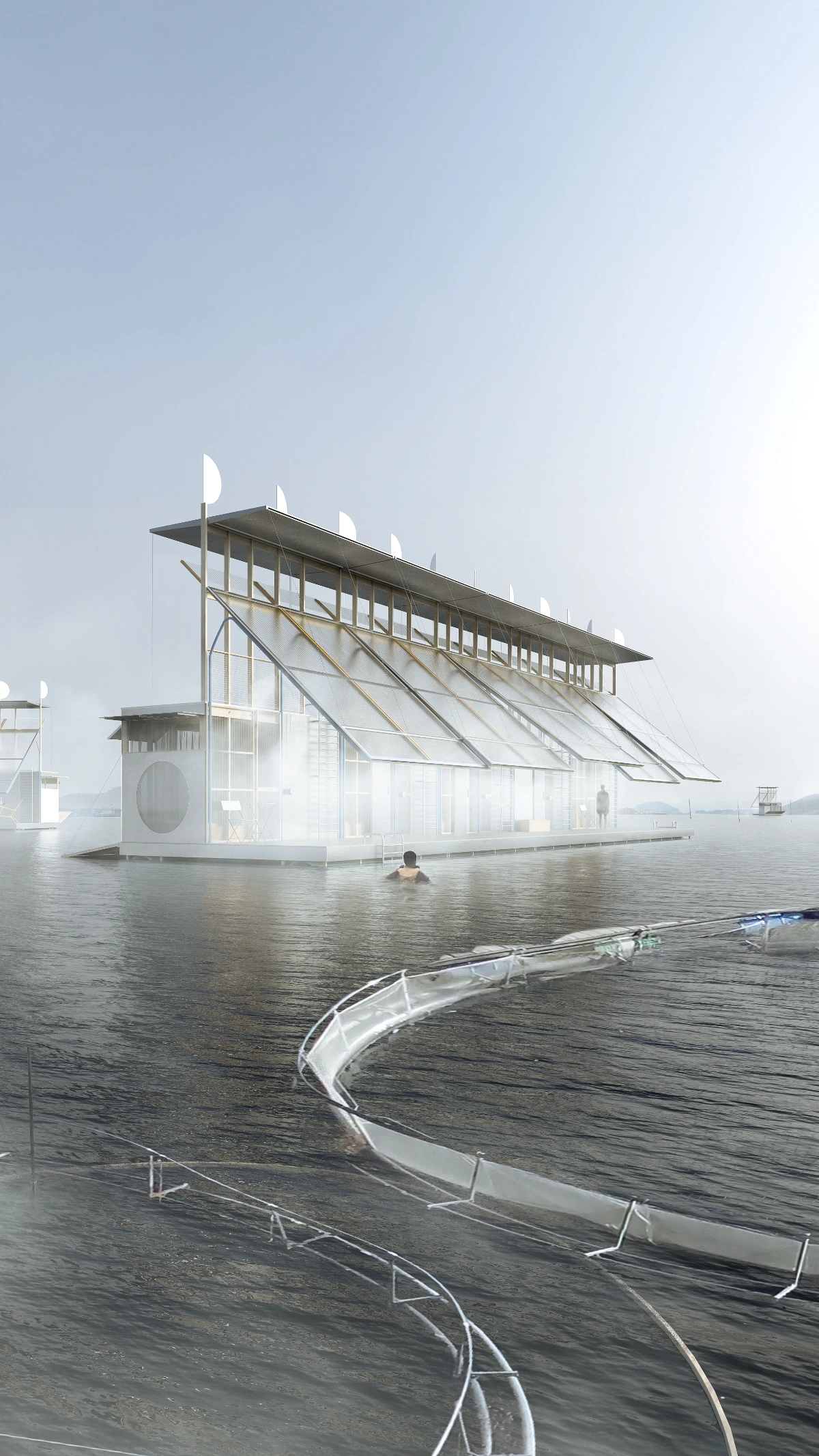 The second residential type is a modular floating unit designed for single or multiple occupants. The interior body is a 2.3*4.4m space including a toilet, living room and bedroom, as a response to the spatial structure of the local boathouse. There are two openings, one facing the 3m long platform, where the ladder to the rooftop is also located; the other faces the water directly. The building features movable elements, such as retractable docking panels and an adjustable roof, allowing it to adapt to its environment. A piping system filters water from the lake and pumps it up to the surface for domestic purposes, and as steam from nozzles under the roof, regulating the skin’s temperature.