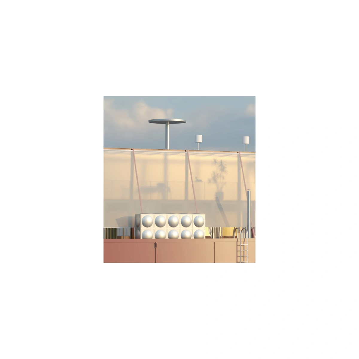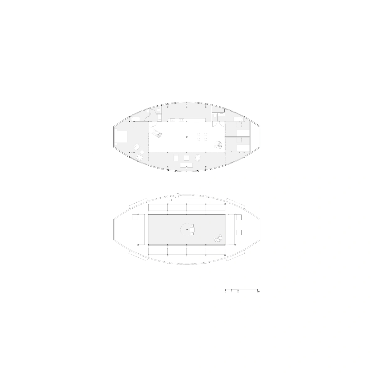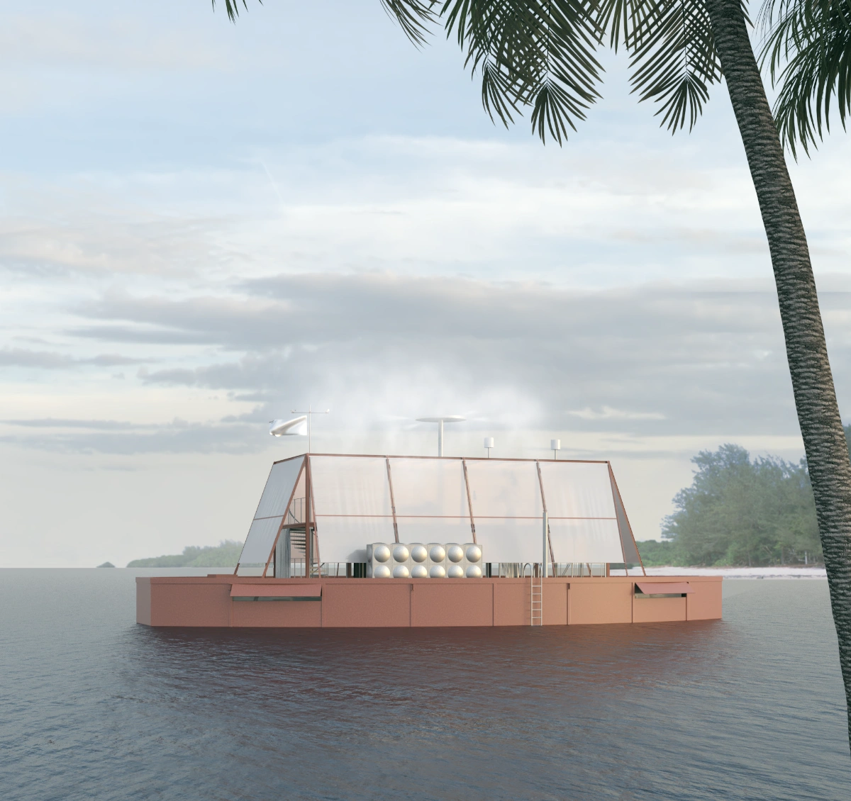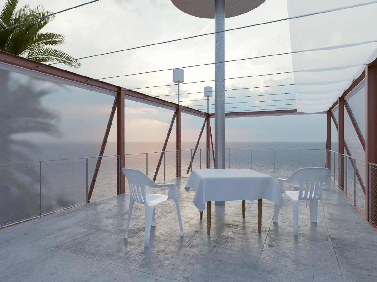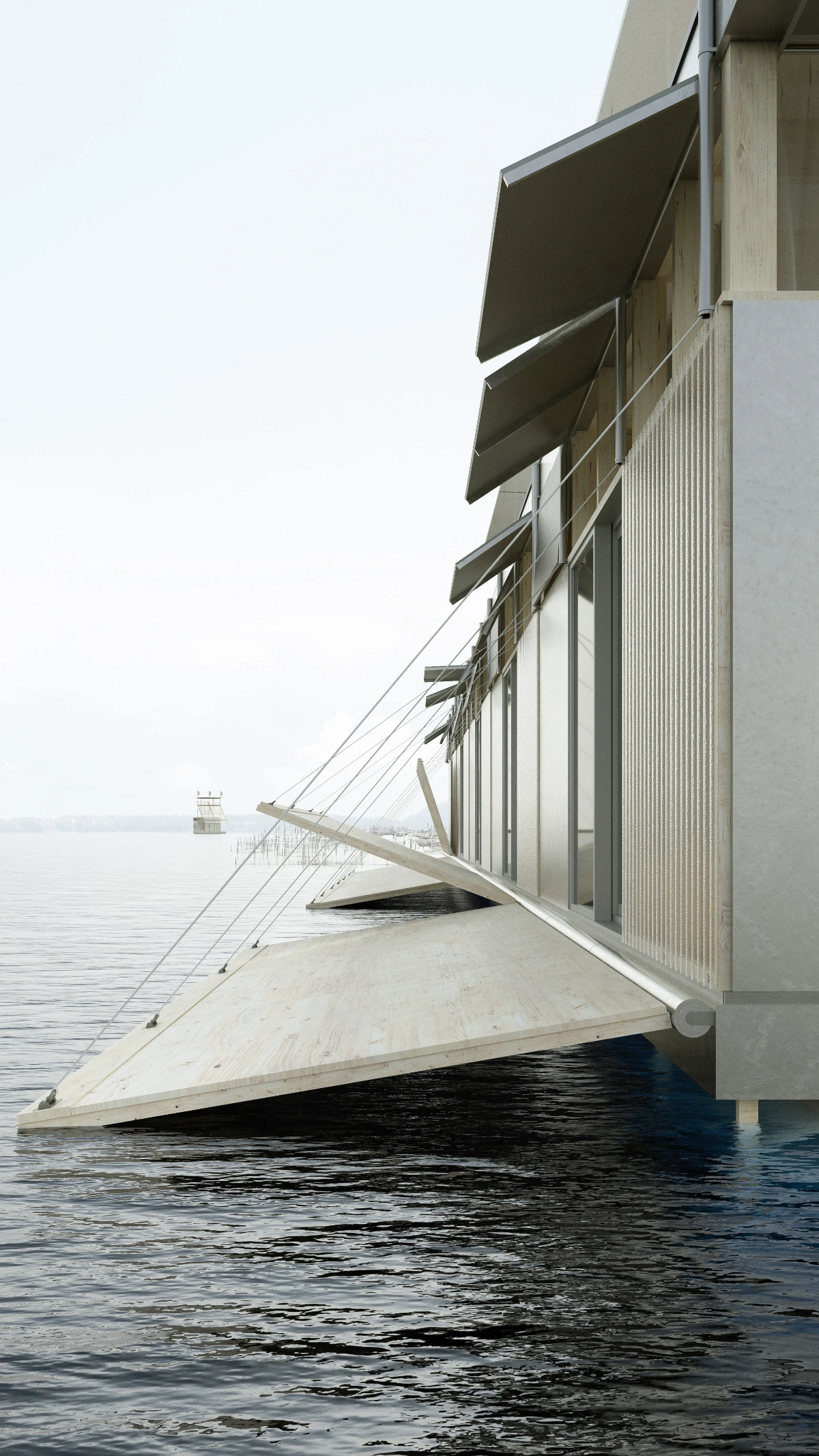The first residence is designed as a boathouse for communal living. It consists of a living floor, elevated deck, and a rooftop garden. The living area is an inverted stilt house, a classic type in Southeast Asia. The elevated stilt structure creates an atrium inside, shielding against direct sunlight and introducing cooled hot air indoors through the height difference. The design incorporates high windows inspired by Middle Eastern wind-catching techniques to enhance ventilation. The third level is a rooftop garden with a cooling mist device at the top. Water is pumped from the hull to the rooftop, with pipes embedded within the central pillar, serving as a multifunctional core—a reinterpretation of the traditional fireplace. After the surrounding is cooled by the mist, it circulates back through the lower living floor.