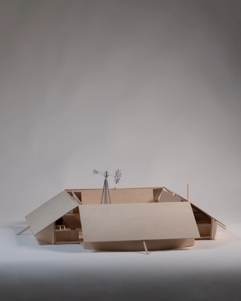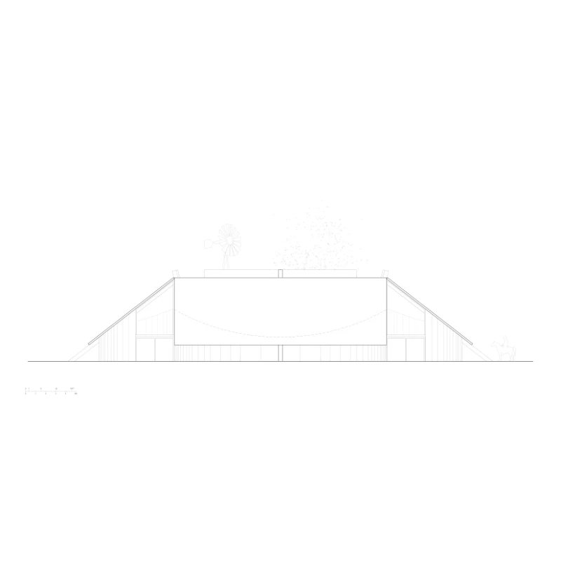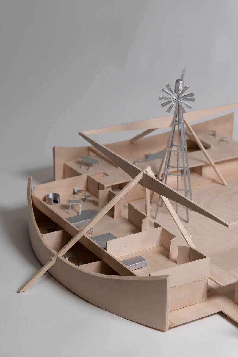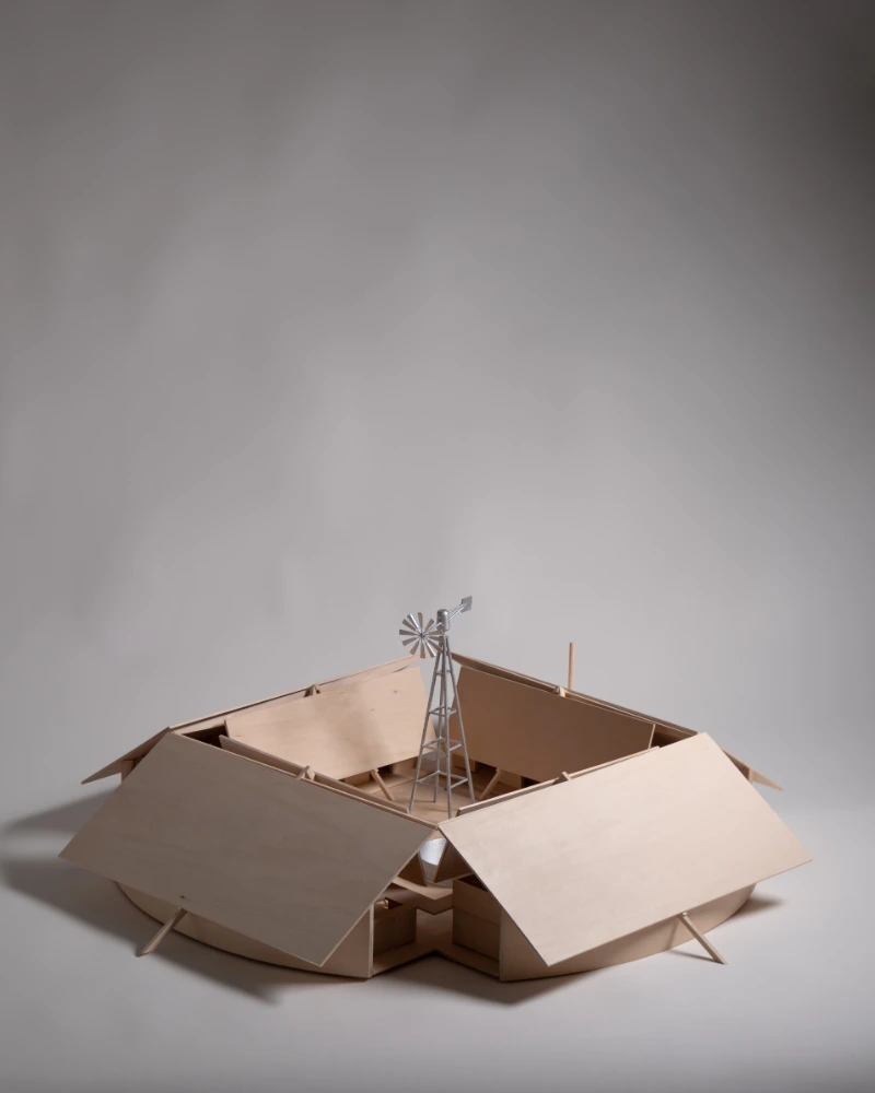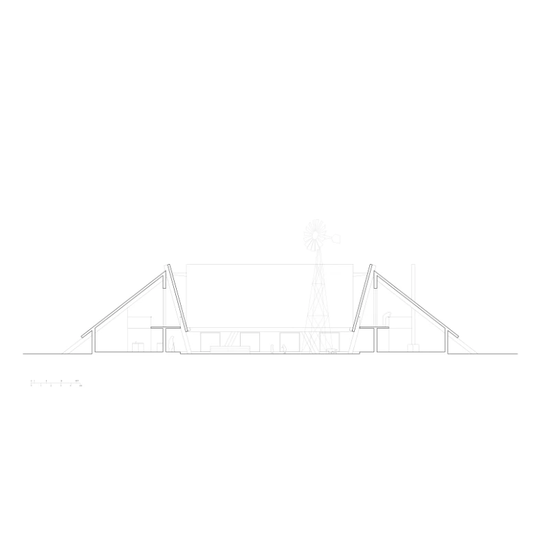 The Big House is conceived as a structure that emerges and floats in the Argentinian countryside, surrounded by water tanks, mills, crops, and some animals. It is usually windy, and the sun is quite strong.
