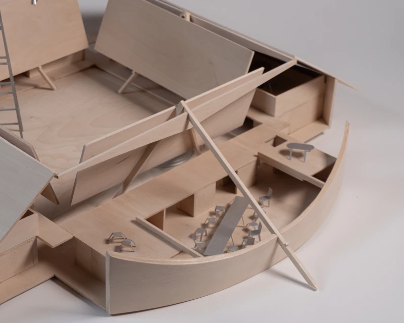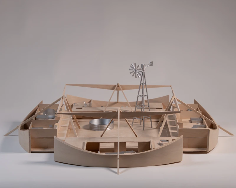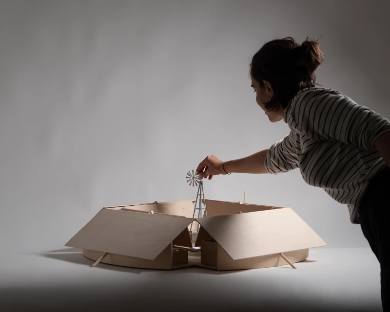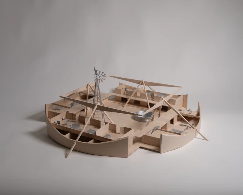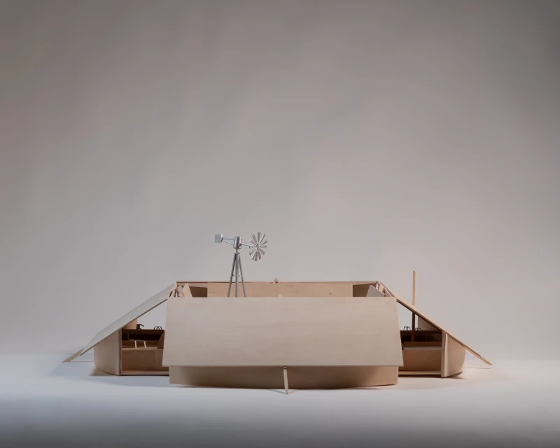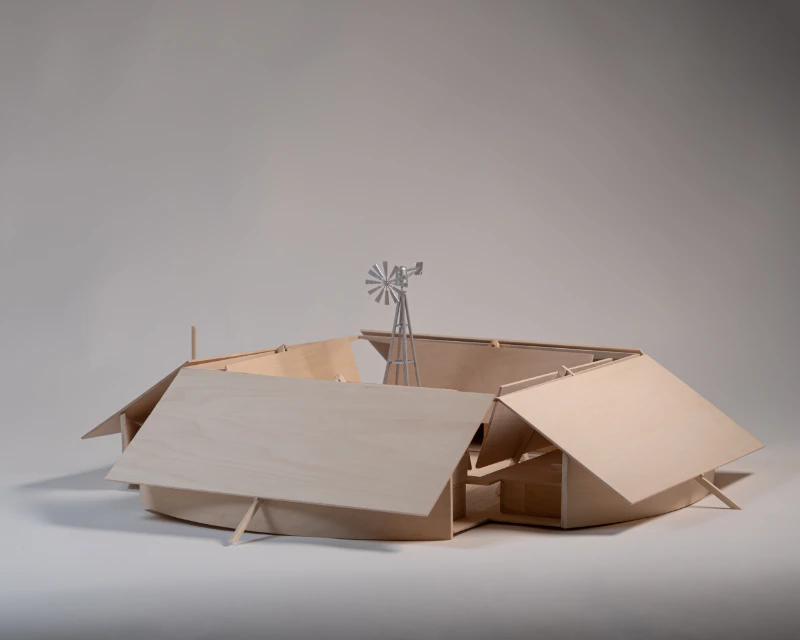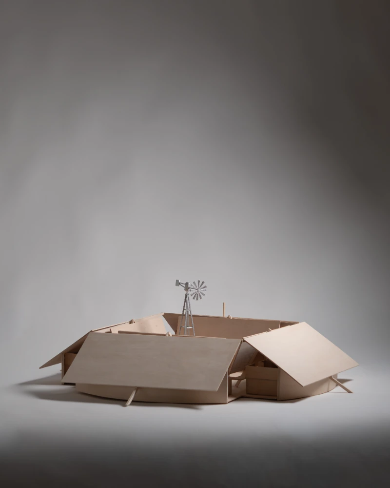 The Big House is conceived as a structure that emerges and floats in the Argentinian countryside, surrounded by water tanks, mills, crops, and some animals. It is usually windy, and the sun is quite strong.