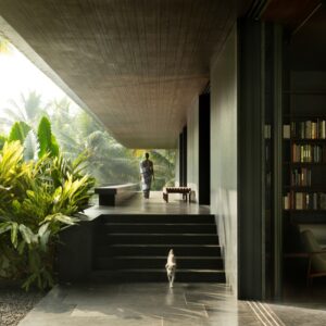 In contrast, the south facade is much more private and intimate. Therefore, the architectural configuration becomes lighter: the concrete roof plane extends into a large cantilever towards the garden, keeping its edge as minimal as possible. Additionally, the south facade features larger windows and openings. Overall, the design at this point aims to blend the entire house with the garden and outdoor pool, thanks to the large windows and the porch created by the aforementioned cantilever.