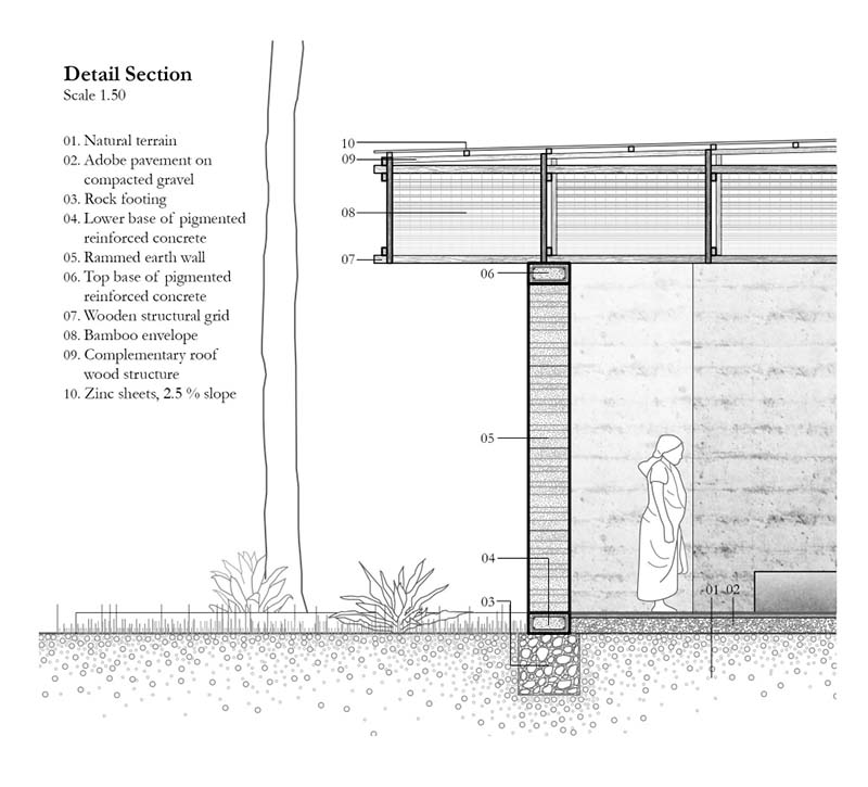 In its stereotomic quality, the wall structure and pavement are modeled on local materials such as laterite earth, red clay, straw, sand and gravel. From the tectonic point of view, the roof that unfolds from the ground, is made up of local wood, an envelope of bamboo and sheets of zinc.