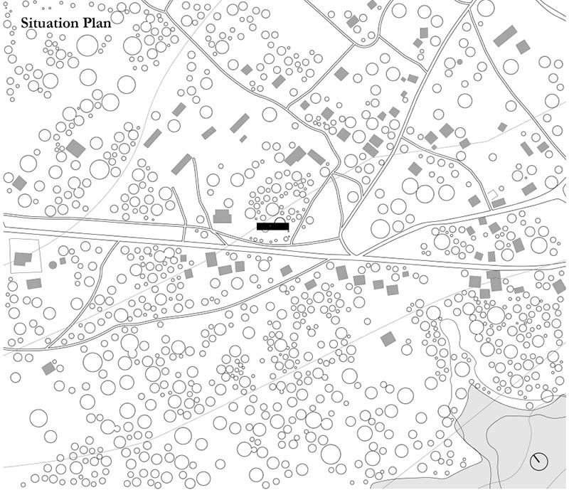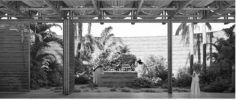 The surface is delineated by the rammed earth wall structure, composed of laterite earth, sand, red clay, straw and small dose of cement. Its thickness allows a good thermal inertia enabling a cool indoor environment. In some situations, its hermetic character is altered by small gaps that allows light to enter and openings that connect with the outside. The walls are erected on a reinforced concrete base that is replicated at the top to receive the roof structure.