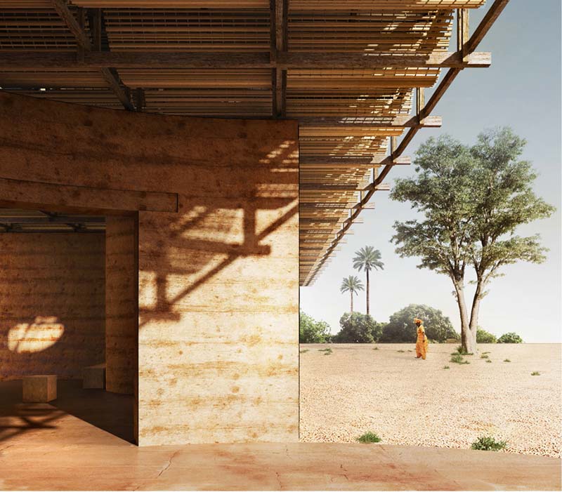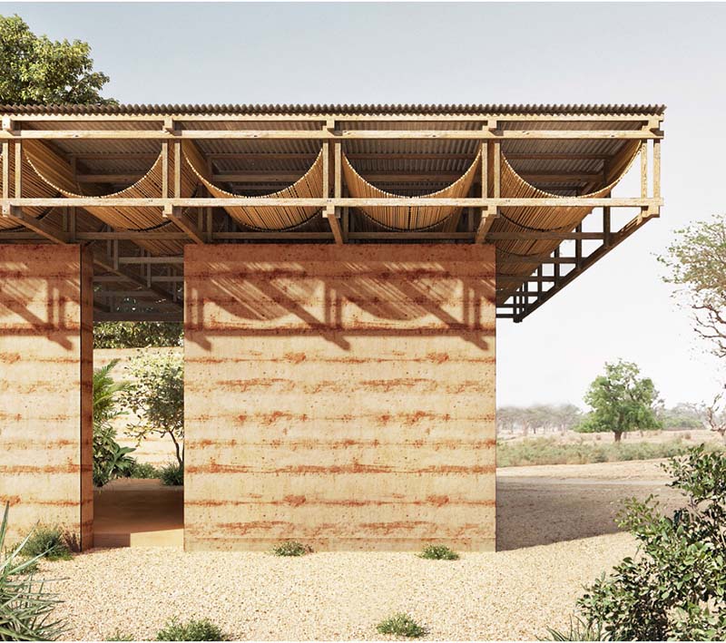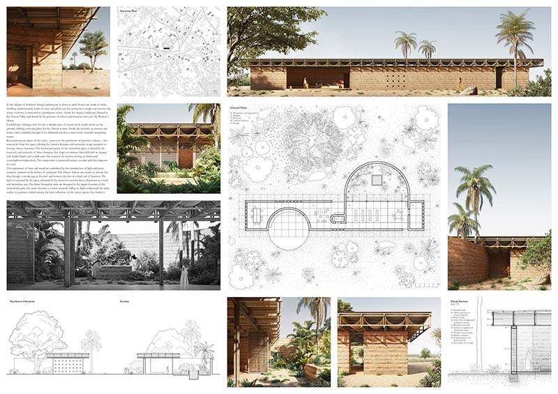 The project aims to resemble traditional construction techniques. I think that one of the charms of Senegalese culture that is reflected in their art, is the quality of expressing feelings with elemental materials such as earth and sand. The harmonic balance established between vernacular constructions and nature, the use of materials that are present in the place in a sober way, are gestures that give character to a sparse and simple architecture that is consider as a reference to project.