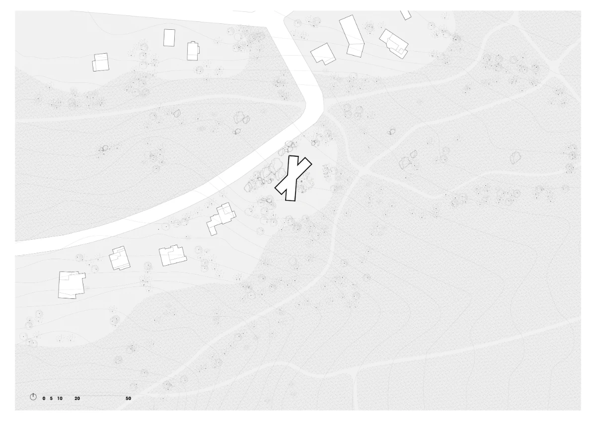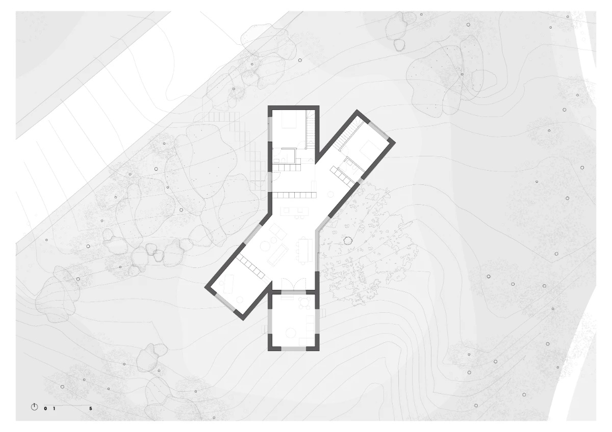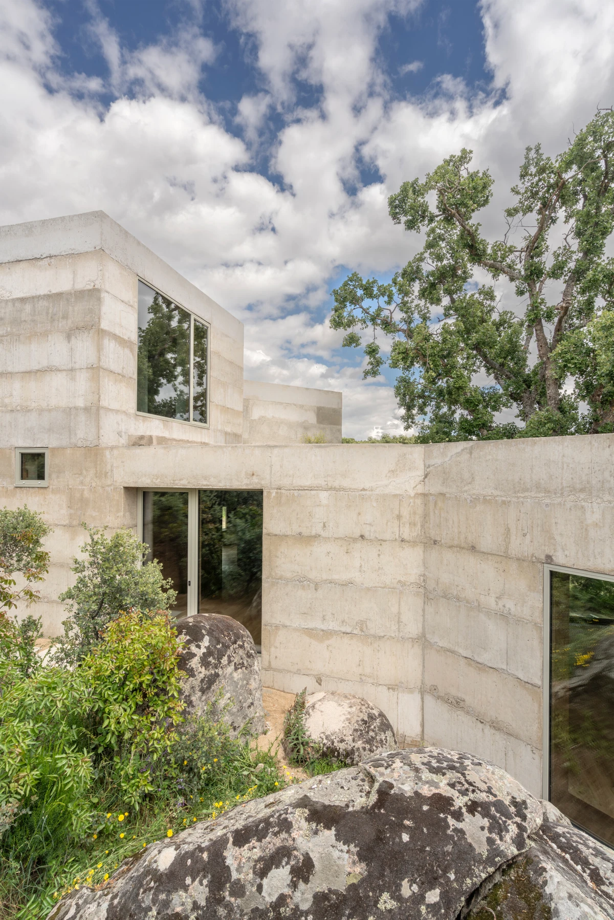 The rocky terrain on which the house is built is defined by a gentle slope and dominated by a centuries-old oak tree, surrounded by holm oaks and kermes oaks growing among massive granite boulders. In response to these natural elements, and drawing on lessons from Coderch’s Ugalde house, the design incorporates an X-shaped floor plan that nests within the rugged landscape, framing views of the surrounding nature from inside.