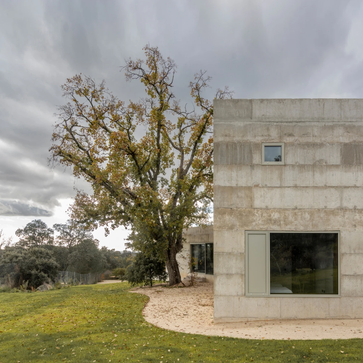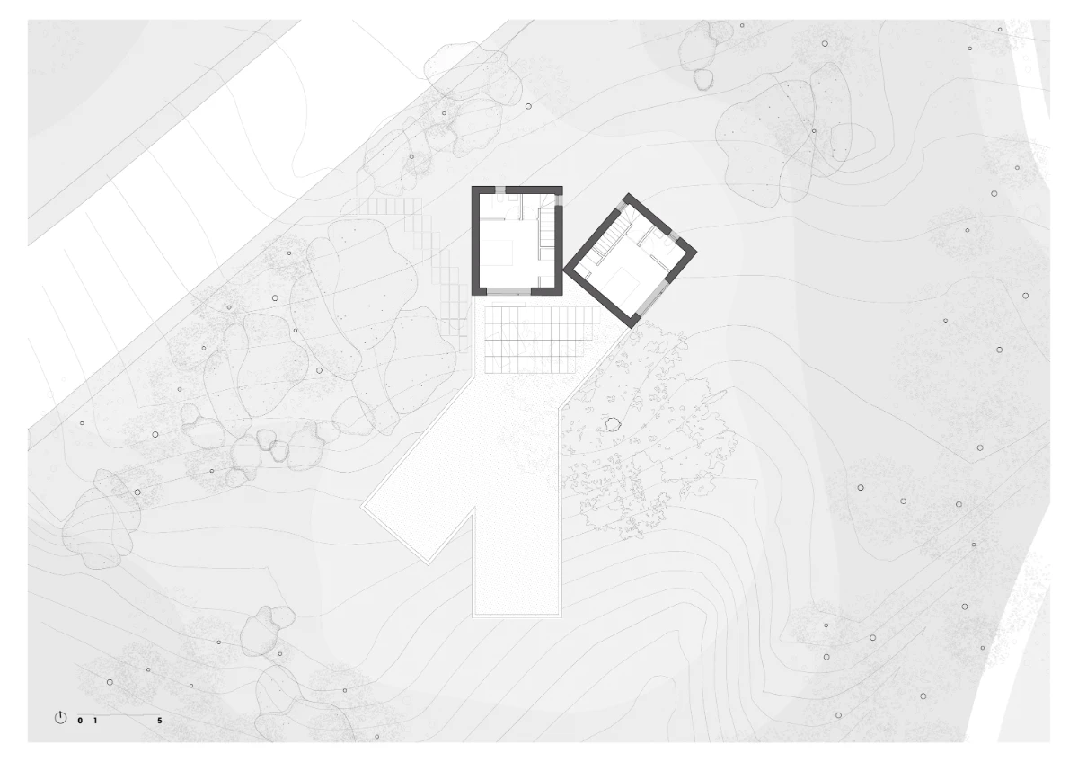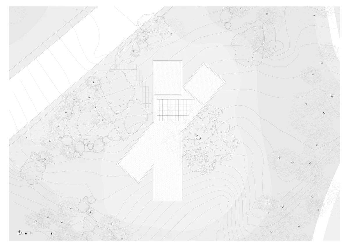 The rocky terrain on which the house is built is defined by a gentle slope and dominated by a centuries-old oak tree, surrounded by holm oaks and kermes oaks growing among massive granite boulders. In response to these natural elements, and drawing on lessons from Coderch’s Ugalde house, the design incorporates an X-shaped floor plan that nests within the rugged landscape, framing views of the surrounding nature from inside.