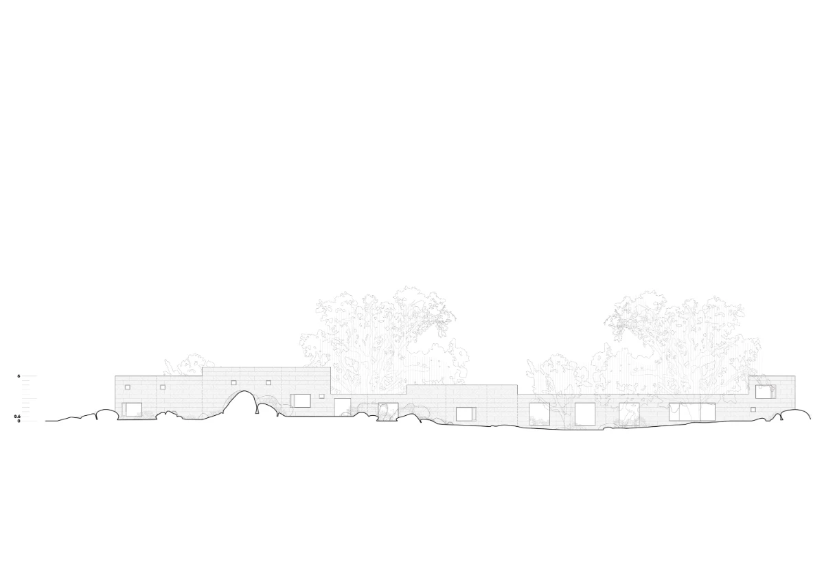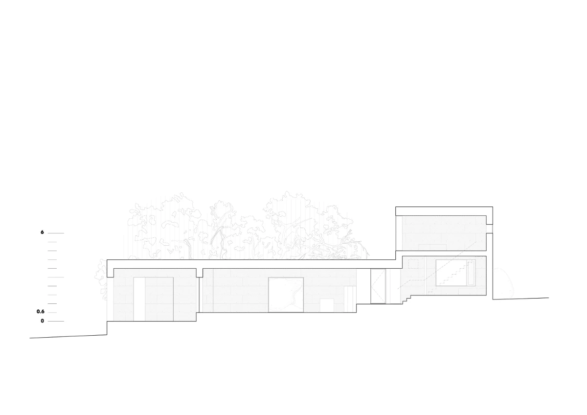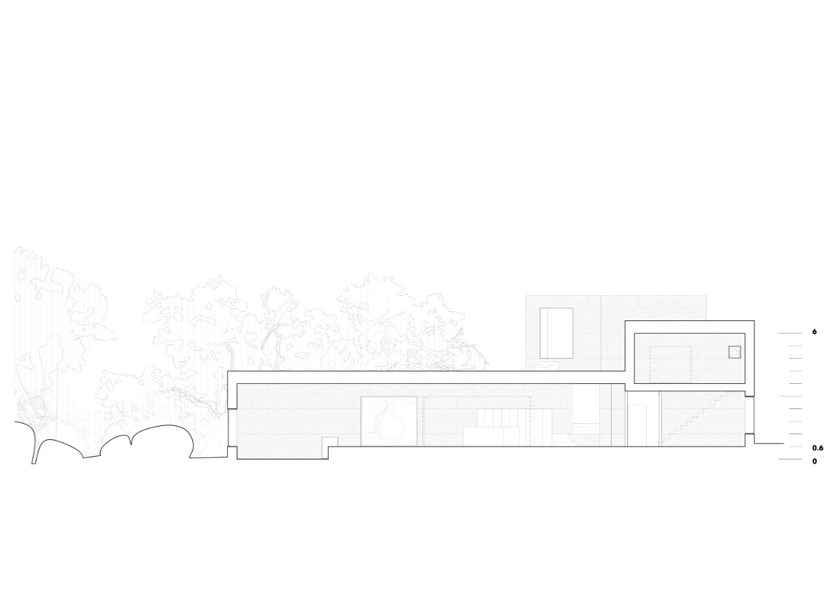 Constructed entirely from on-site concrete made with local aggregates, the house is designed for long-term durability, proposing its own lasting permanence as an alternative approach to sustainability, a complex term often treated lightly, leading to architectures that prioritize representing sustainability rather than genuinely promoting it. The 50 cm thick walls are built by hand in 60 cm high layers, incorporating insulation between the inner and outer concrete layers. The result is a wall of large, exposed stones that are visible both inside and outside. While the average lifespan of a house might be 50 years, the X House is built to endure for generations, deeply anchored in the landscape, much like the granite boulders and trees that surround